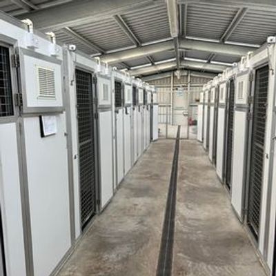 There are 12 dog kennels with space for up to 20 dogs. Each kennel has an indoor sleeping area with heating. There is an outdoor run for each kennel which is roofed giving the dogs the option of lying in the sun or shade when outside. The kennel building makes extensive use of glass doors and roof lights to achieve a light and airy ambience, There is also music for the dogs to enjoy. Research has shown that this has a positive effect on reducing anxiety and stress for dogs in kennels.